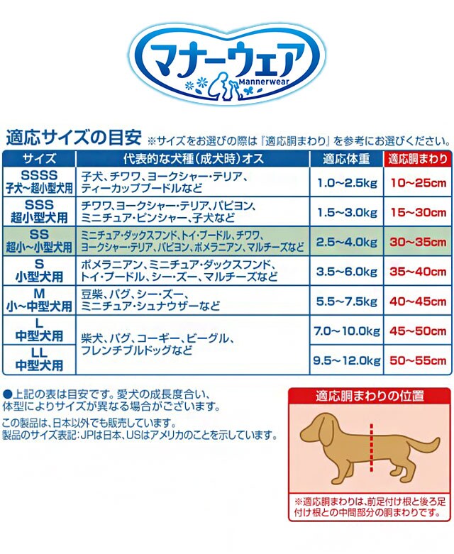 ●お使いになる前に使用上の注意を必ずお読みになり、使用中はこの袋を保管してください。●本品は取り出し時に製品同士がくっついて出てくる場合がありますが、品質上問題はございませんので、安心してご使用いただけます。●本品は使い捨ての紙オムツですので、洗濯しないでください。●万が一、製品の中身が人の目に入った場合は流水で洗い流し、医師にご相談ください。動物の目に入った場合は、獣医師にご相談ください。●本品は切って使用すると、中身が飛び散ったり、汚れやモレの原因となる為、そのままで使用してください。●本品は食べられないので、飲み込まないでください。●万が一、飲み込んだり吸い込んだりした場合は、医師や獣医師にご相談ください。●テープは皮膚・被毛につけないでください。●万が一、身体に異常を感じた場合はご使用を控え、医師や獣医師にご相談ください。●特に肌が弱い場合やアレルギー体質の場合は、使用に十分注意してください。※本品は愛犬の体調や尿量、使用環境によっては機能が十分に発揮できない場合があります。※香料はマナーウェアの外側の不織布部分に塗布をしています。