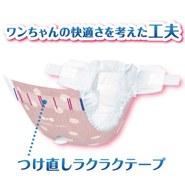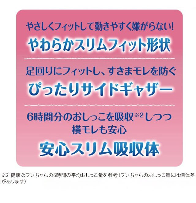 そそう・生理に安心。お出かけ先でもおうちでも!「やわらかスリムフィット形状」で、やさしくフィットして動きやすく嫌がらない。「ぴったりサイドギャザー」で、足回りにフィットし、すきまモレを防ぐ。「安心スリム吸収体」で、6時間分のおしっこを吸収※健康なワンちゃんの6時間の平均おしっこ量を参考(ワンちゃんのおしっこ量には個体差があります)