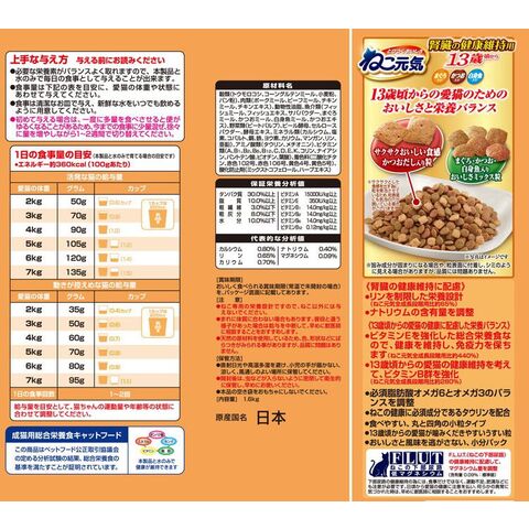 穀類(トウモロコシ、コーングルテンミール、小麦粉、パン粉)、肉類(ポークミール、ビーフミール、チキンミール、チキンエキス)、動物性油脂、魚介類(フィッシュミール、フィッシュエキス、サバパウダー、まぐろミール、かつおミール、白身魚ミール、かつおエキス)、野菜類(ビートパルプ)、ビール酵母、セルロースパウダー、酵母エキス、ミネラル類(カルシウム、塩素、コバルト、銅、鉄、ヨウ素、カリウム、マンガン、リン、亜鉛)、アミノ酸類(タウリン、メチオニン)、ビタミン類(A、B1、B2、B6、B12、C、D、E、K、コリン、ナイアシン、パントテン酸、ビオチン、葉酸)、着色料(二酸化チタン、赤色102号、赤色106号、黄色4号、黄色5号)、酸化防止剤(ミックストコフェロール、ハーブエキス)