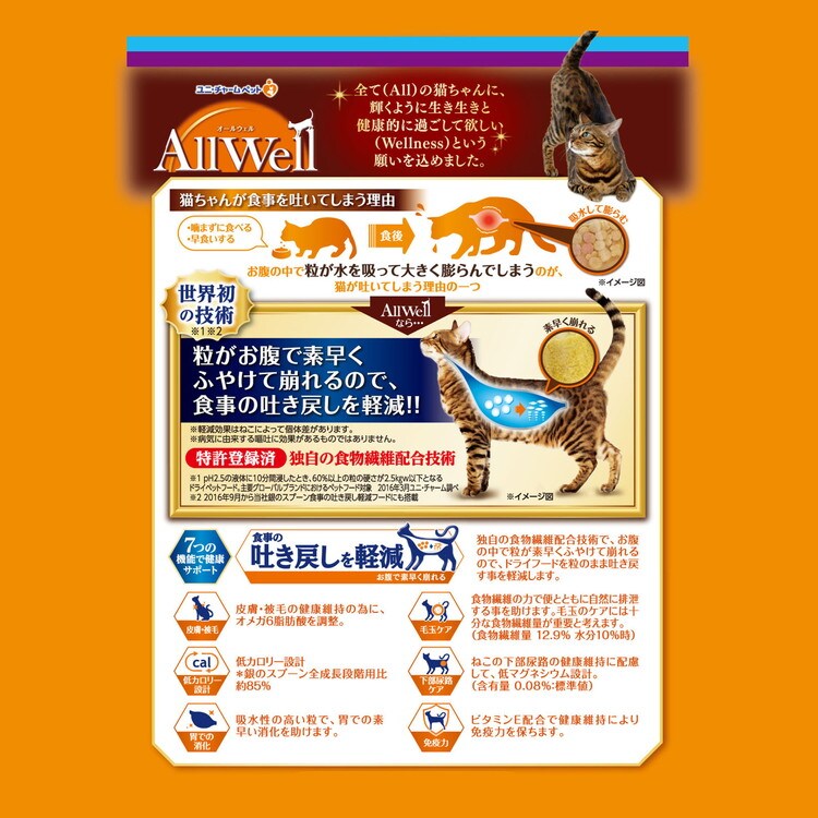 独自の食物繊維配合技術で、お腹の中で粒が素早くふやけて崩れるので、ドライフードを粒のまま吐き戻す事を軽減します。