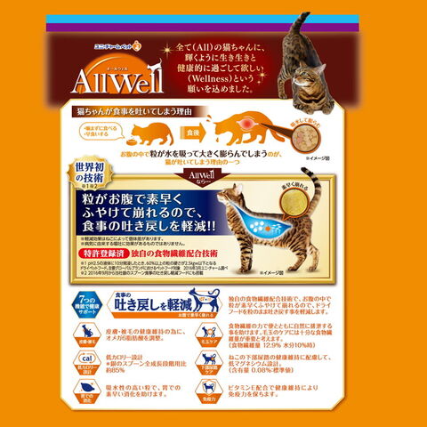独自の食物繊維配合技術で、お腹の中で粒が素早くふやけて崩れるので、ドライフードを粒のまま吐き戻す事を軽減します。