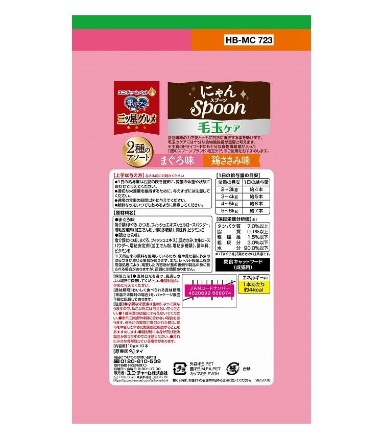 【4個セット】 ユニチャーム 銀のスプーン三ツ星グルメおやつ にゃんSpoon毛玉ケア2種のアソートまぐろ&鶏ささみ味100g【ポイント10倍】 【送料無料】