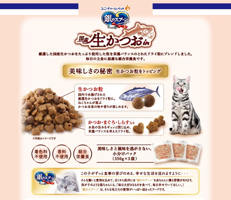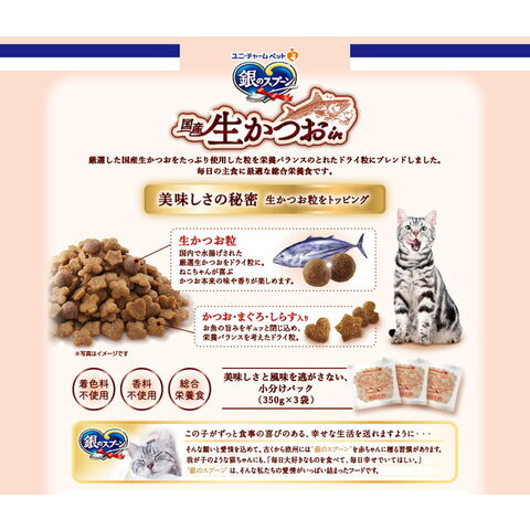 厳選した国産生かつおをたっぷり使用した粒を栄養バランスのとれたドライ粒にブレンドしました。毎日の主食に最適な総合栄養食です。