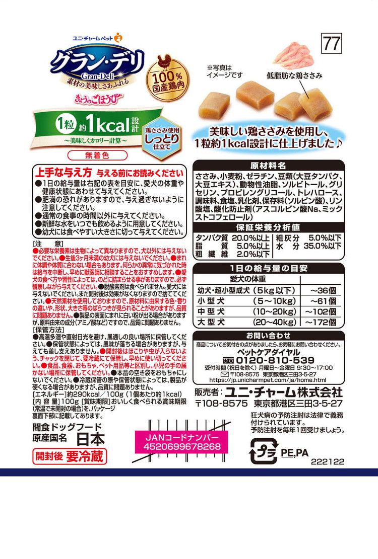 ささみ、小麦粉、ゼラチン、豆類(大豆タンパク、大豆エキス)、動物性油脂、ソルビトール、グリセリン、プロピレングリコール、トレハロース、調味料、食塩、乳化剤、保存料(ソルビン酸)、リン酸塩、酸化防止剤(アスコルビン酸Na、ミックストコフェロール)