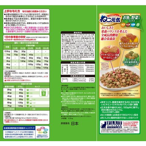 穀類(トウモロコシ、コーングルテンミール、小麦粉、パン粉)、肉類(チキンミール、ポークミール、ビーフミール、チキンエキス)、豆類(脱脂大豆)、動物性油脂、魚介類(フィッシュミール、フィッシュエキス、白身魚ミール、まぐろエキス、かつおエキス)、ビール酵母、野菜類(ニンジンパウダー、カボチャパウダー、ホウレンソウパウダー)、酵母エキス、ミネラル類(カルシウム、塩素、コバルト、銅、鉄、ヨウ素、カリウム、マンガン、ナトリウム、リン、亜鉛)、アミノ酸類(タウリン、メチオニン)、ビタミン類(A、B1、B2、B6、B12、C、D、E、K、コリン、ナイアシン、パントテン酸、ビオチン、葉酸)、着色料(二酸化チタン、赤色40号、赤色102号、赤色106号、黄色4号、黄色5号、青色1号)、酸化防止剤(ミックストコフェロール、ハーブエキス)