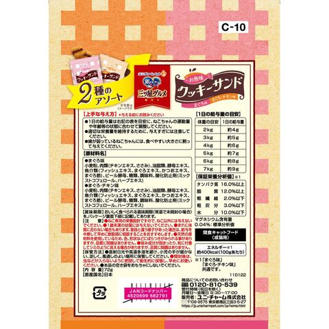小麦粉、肉類(チキンエキス、ささみ)、油脂類、酵母エキス、魚介類(フィッシュエキス、まぐろエキス、かつおエキス、まぐろ節)、ビール酵母、糖類、調味料、酸化防止剤(ミックストコフェロール、ハーブエキス)