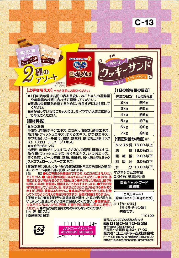 【6個セット】 ユニチャーム 銀のスプーン三ツ星グルメおやつ お魚味クッキーサンド 2種のアソートかつお&まぐろチキン味 72g【ポイント10倍】 【送料無料】