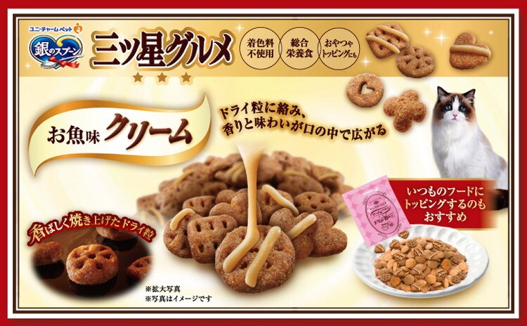 ・香ばしく焼き上げたドライ粒にお魚味クリームが絡み、香りと味わいがお口の中で広がる美味しいキャットフードです。
