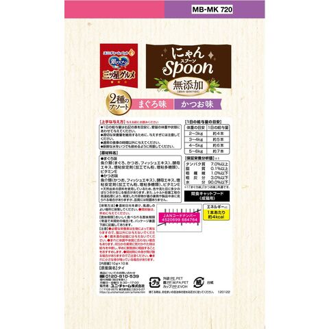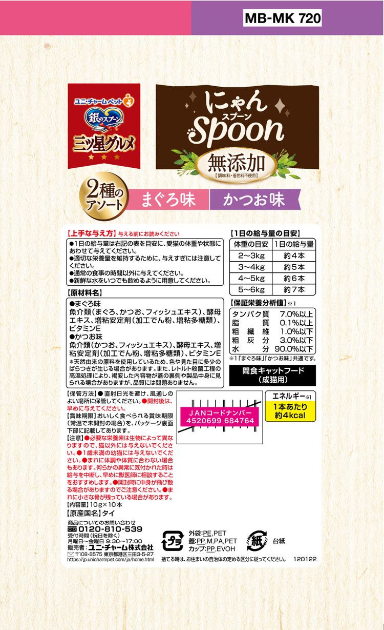 【6個セット】 ユニチャーム 銀のスプーン三ツ星グルメおやつ にゃんSpoon 無添加2種のアソートまぐろ&かつお味 100g【ポイント10倍】 【送料無料】