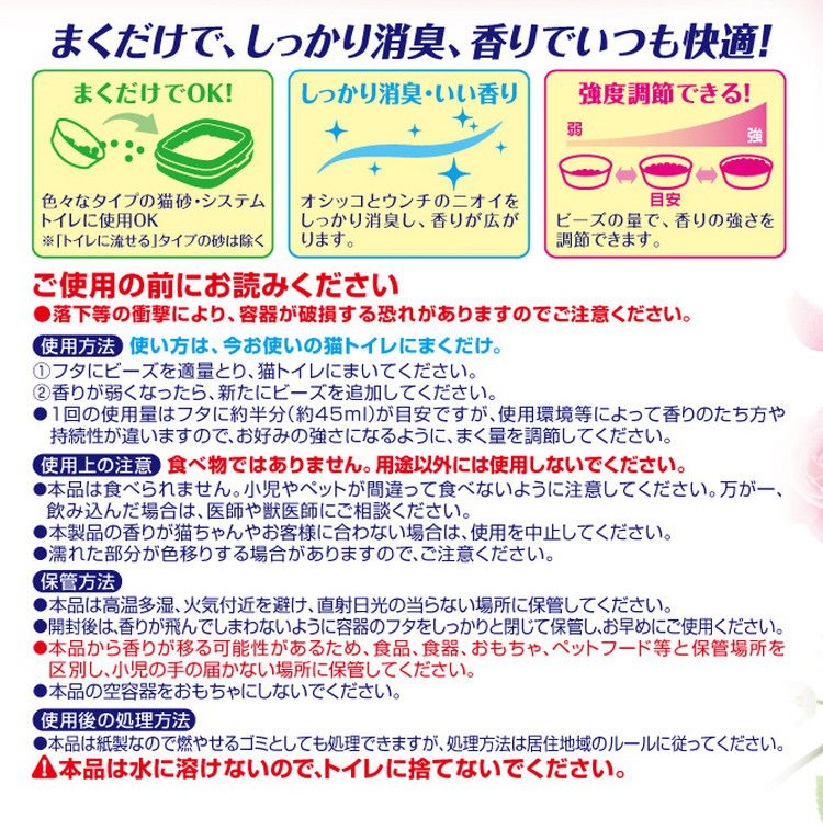 ・ビーズをまく量で、お好みの香りの強さに調節できます。香りに敏感な猫ちゃんもこれなら安心です。
