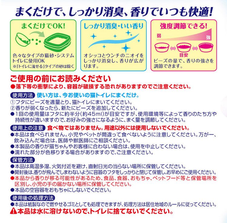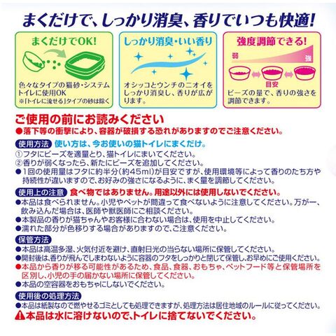 今お使いの猫トイレにまくだけで、しっかり消臭!香りが広がる♪猫用消臭ビーズです。