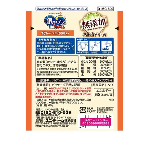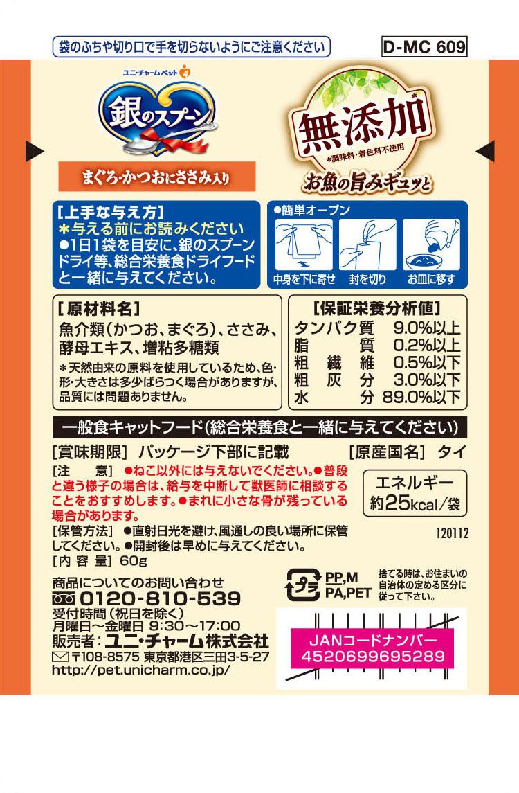 【30個セット】 ユニチャーム 銀のスプーンパウチ 無添加まぐろ・かつおにささみ入り 60g【ポイント10倍】 【送料無料】
