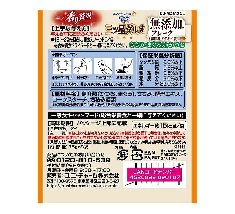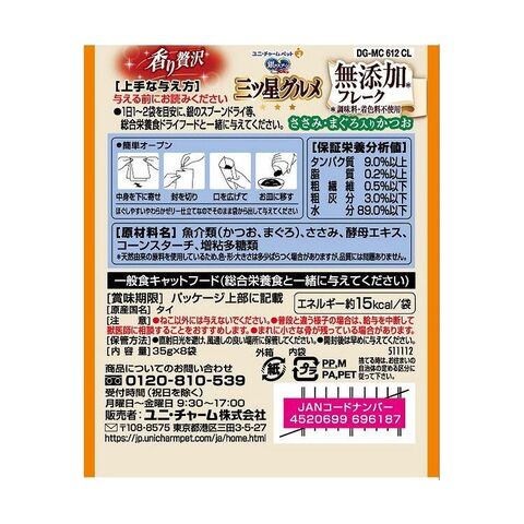 魚介類(かつお、まぐろ)、ささみ、酵母エキス、コーンスターチ、増粘多糖類