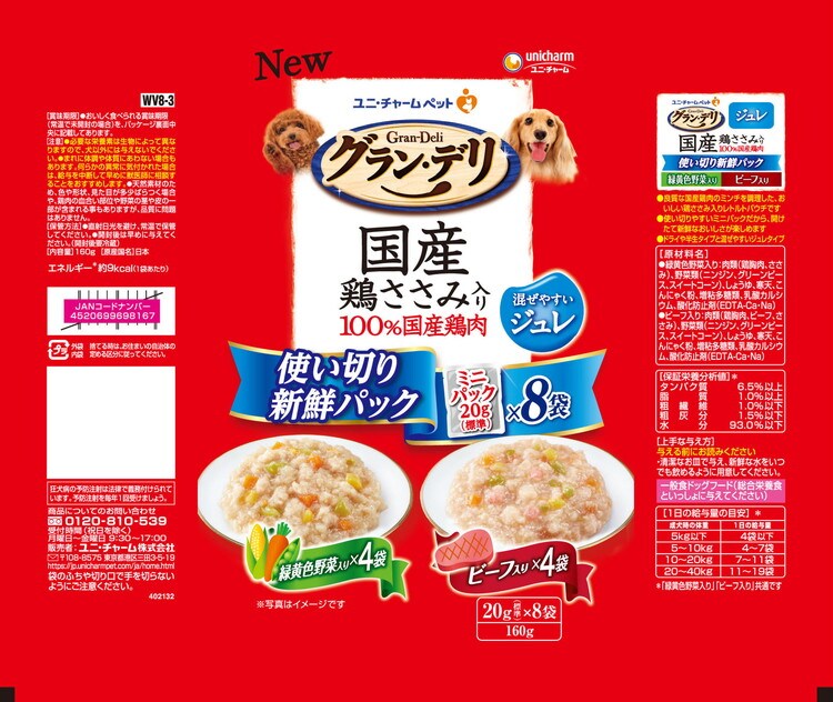 【12個セット】 ユニチャーム グラン・デリ 国産鶏ささみ入りパウチ 使い切り新鮮パックジュレ 成犬用 緑黄色野菜入り&ビーフ入り160g (20g×8)【ポイント10倍】 【送料無料】