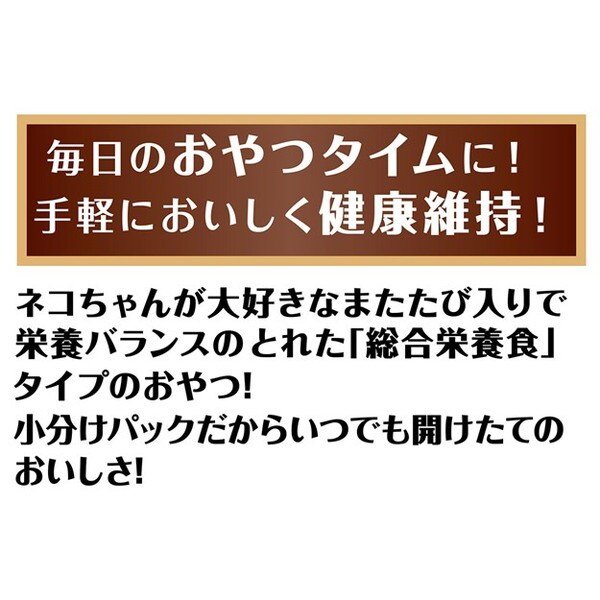 ネコちゃんが大好きなまたたび入りで、栄養バランスのとれた「総合栄養食」タイプのおやつ!小分けパックだからいつでも開けたてのおいしさ!ネコちゃんの大好きなシーフードミックス味。
