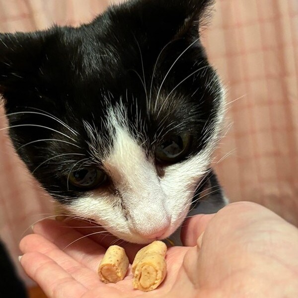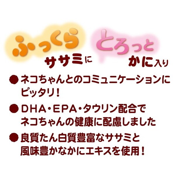 鶏ササミ、かつお、でんぷん類、大豆たん白、たん白加水分解物、かにエキス、酵母エキス、魚油(DHA・EPA含有)、ソルビトール、増粘安定剤(グァーガム)、カゼインNa、タウリン、酸化防止剤(V. E)