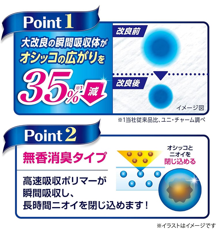 高速吸収ポリマーが瞬間吸収し、長時間ニオイを閉じ込めます!