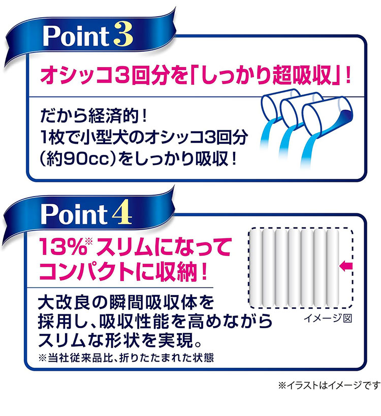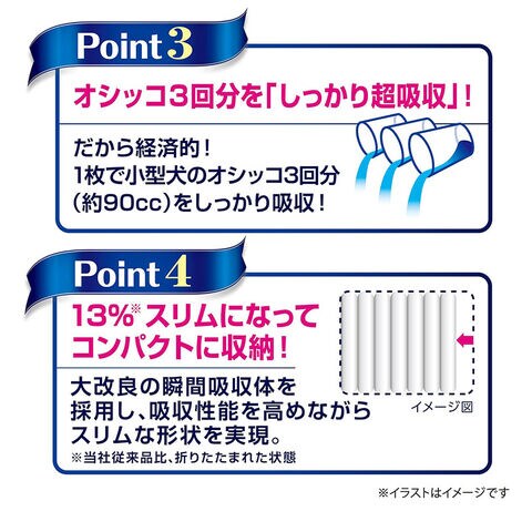 1枚で小型犬のオシッコ5回分(約150cc*)をしっかり吸収!だから経済的!(*小型犬の平均オシッコ量から算出)