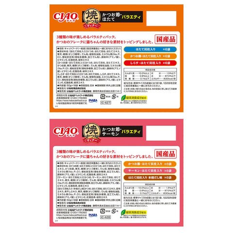 【サーモン・ほたて貝柱入り】かつお、サーモン、ほたて貝柱、ほたてエキス、寒天、糖類(オリゴ糖等)、でん粉、植物性油脂、ミネラル類(Na、P、Cl)、増粘安定剤(増粘多糖類、加工でん粉)、調味料(アミノ酸)、ビタミンE、色素、緑茶エキス