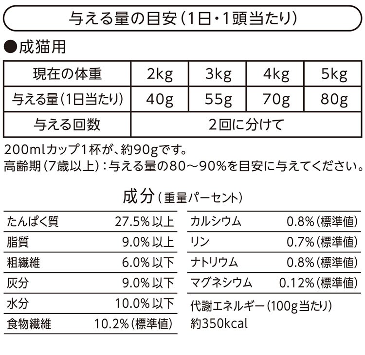 穀類(とうもろこし、小麦粉、コーングルテンミール)、肉類(ミートミール、チキンミール、チキンレバーパウダー)、豆類(脱脂大豆)、油脂類(動物性油脂)、セルロース、魚介類(フィッシュエキス、白身魚エキス、熟成まぐろ、熟成かつお)、ビートパルプ、セレン酵母、ビタミン類(A、D3、E、K3、B1、B2、パントテン酸、ナイアシン、B6、葉酸、ビオチン、B12、コリン、イノシトール)、ミネラル類(カルシウム、リン、ナトリウム、カリウム、塩素、鉄、コバルト、銅、マンガン、亜鉛、ヨウ素)、アミノ酸類(メチオニン、タウリン)、クチナシ色素、酸化防止剤(ローズマリー抽出物、ミックストコフェロール)
