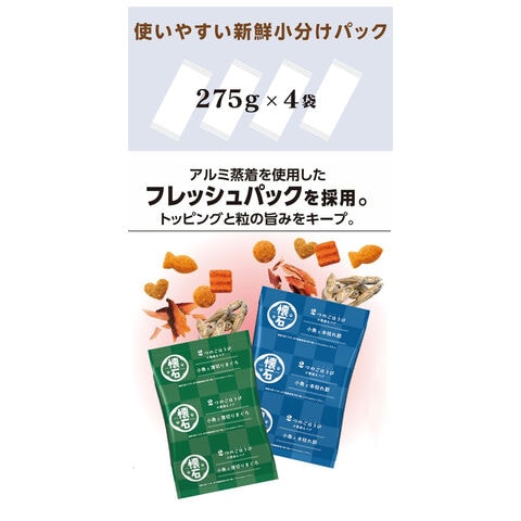 ・トッピングされた2種のアルミ蒸着分包が275g×4パック入りで美味しさをキープ。