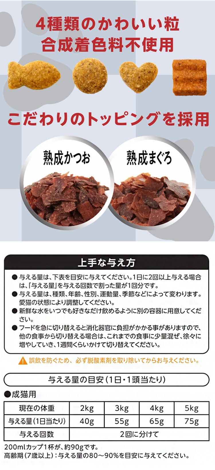 穀類(とうもろこし、小麦粉、コーングルテンミール)、肉類(ミートミール、チキンミール、チキンレバーパウダー)、豆類(脱脂大豆)、油脂類(動物性油脂)、セルロース、魚介類(フィッシュエキス、白身魚エキス、熟成まぐろ、熟成かつお)、ビートパルプ、セレン酵母、ビタミン類(A、D3、E、K3、B1、B2、パントテン酸、ナイアシン、B6、葉酸、ビオチン、B12、コリン、イノシトール)、ミネラル類(カルシウム、リン、ナトリウム、カリウム、塩素、鉄、コバルト、銅、マンガン、亜鉛、ヨウ素)、アミノ酸類(メチオニン、タウリン)、クチナシ色素、酸化防止剤(ローズマリー抽出物、ミックストコフェロール)