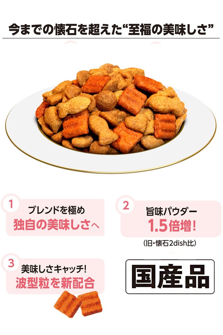 穀類(とうもろこし、小麦粉、コーングルテンミール)、肉類(ミートミール、チキンミール、チキンレバーパウダー)、豆類(脱脂大豆)、油脂類(動物性油脂)、魚介類(フィッシュエキス、白身魚エキス、かつお節、いりこ、かにかまチップ、かつお枯れ節削り)、セレン酵母、ビタミン類(A、D3、E、K3、B1、B2、パントテン酸、ナイアシン、B6、葉酸、ビオチン、B12、コリン、イノシトール)、ミネラル類(カルシウム、リン、ナトリウム、カリウム、塩素、鉄、コバルト、銅、マンガン、亜鉛、ヨウ素)、アミノ酸類(メチオニン、タウリン)、クチナシ色素、酸化防止剤(ローズマリー抽出物、ミックストコフェロール)