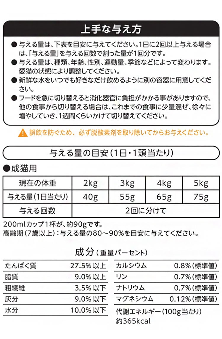 穀類(とうもろこし、小麦粉、コーングルテンミール)、肉類(ミートミール、チキンミール、チキンレバーパウダー)、豆類(脱脂大豆)、油脂類(動物性油脂)、魚介類(フィッシュエキス、白身魚エキス、いりこ、かつお枯れ節削り、まぐろ節)、セレン酵母、ビタミン類(A、D3、E、K3、B1、B2、パントテン酸、ナイアシン、B6、葉酸、ビオチン、B12、コリン、イノシトール)、ミネラル類(カルシウム、リン、ナトリウム、カリウム、塩素、鉄、コバルト、銅、マンガン、亜鉛、ヨウ素)、アミノ酸類(メチオニン、タウリン)、クチナシ色素、酸化防止剤(ローズマリー抽出物、ミックストコフェロール)