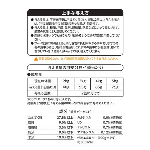 穀類(とうもろこし、小麦粉、コーングルテンミール)、肉類(ミートミール、チキンミール、チキンレバーパウダー)、豆類(脱脂大豆)、油脂類(動物性油脂)、魚介類(フィッシュエキス、白身魚エキス、いりこ、かつお枯れ節削り、まぐろ節)、セレン酵母、ビタミン類(A、D3、E、K3、B1、B2、パントテン酸、ナイアシン、B6、葉酸、ビオチン、B12、コリン、イノシトール)、ミネラル類(カルシウム、リン、ナトリウム、カリウム、塩素、鉄、コバルト、銅、マンガン、亜鉛、ヨウ素)、アミノ酸類(メチオニン、タウリン)、クチナシ色素、酸化防止剤(ローズマリー抽出物、ミックストコフェロール)