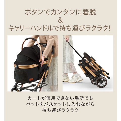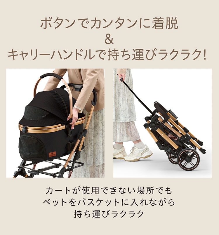 バスケットを簡単に付け外しでき、1台でカート・キャリー・ハウスとしておでかけ先での場面ごとに使い分けが可能。