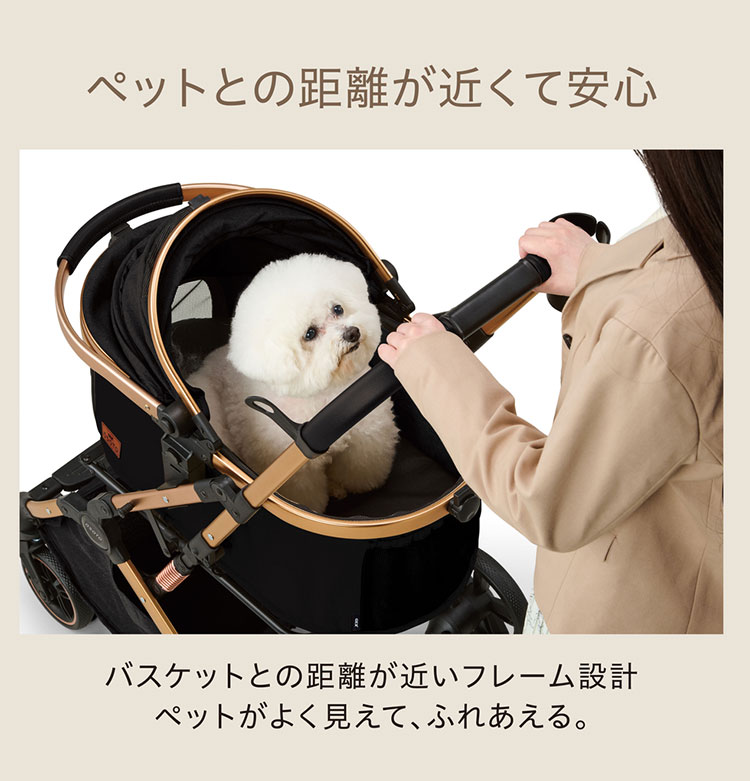 バスケットとの距離が近いフレーム設計で、ペットの様子がよく見え、触れ合えます。