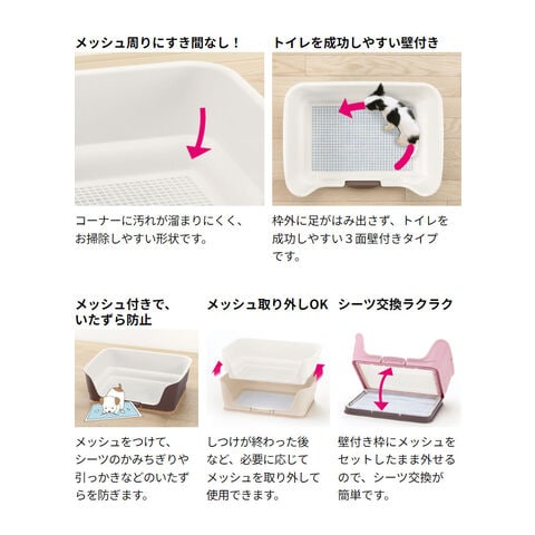 子犬がトイレをおぼえやすい3面壁付きなので、トイレのしつけがしやすく、おしっこの飛び散りや漏れを抑えます。
