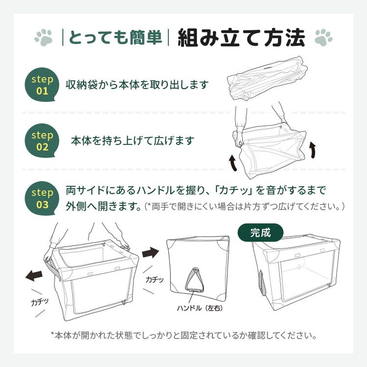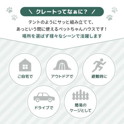 ・テントのようにサッと組み立てて、あっという間に使えるペットハウスです!場所を選ばず様々なシーンで活躍します。
