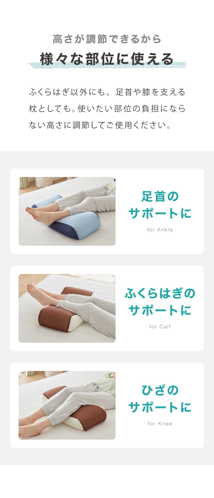 高さ調節が可能なので膝にも、ふくらはぎにも、足首にも仕様可能です。