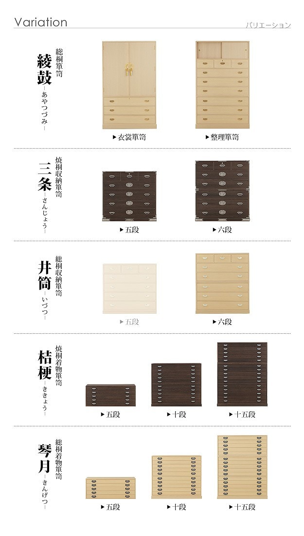商品について:5段(大引出し4杯+小引出し3杯)の総桐収納箪笥。23mm厚の天然木をふんだんに使用した贅沢なつくり。板が厚いと狂いも少なくなりますので、長くお使いいただけます。引出しの組み手は強度に優れた「蟻組み加工」を用い、金釘を使用しておりません。小引出し(中央)の1杯には鍵が付いています。大引出しはたとう紙が入る大きさですので着物の収納に最適です。取っ手の金具には縁起が良いとされる七宝をあしらいました。匠による伝統の技で、堅牢に美しく仕上げたこだわりの桐タンスです。
