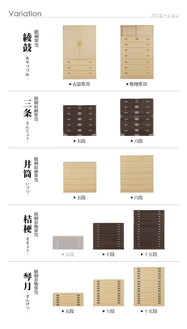 商品について:引出し5段の着物箪笥。趣のある焼桐仕上げです。18mm厚の天然木をふんだんに使用した贅沢なつくり。板が厚いと狂いも少なくなりますので、長くお使いいただけます。引出しはしっかりしたつくりの「留め加工」を用い、金釘を使用しておりません。また、引出しの横には溝がありますので、持ち手にすれば持ち運びの際に便利。取っ手の金具には縁起が良いとされる七宝をあしらいました。たとう紙が入る大きさですので着物の収納に最適です。匠による伝統の技で、堅牢に美しく仕上げたこだわりの桐タンスです。