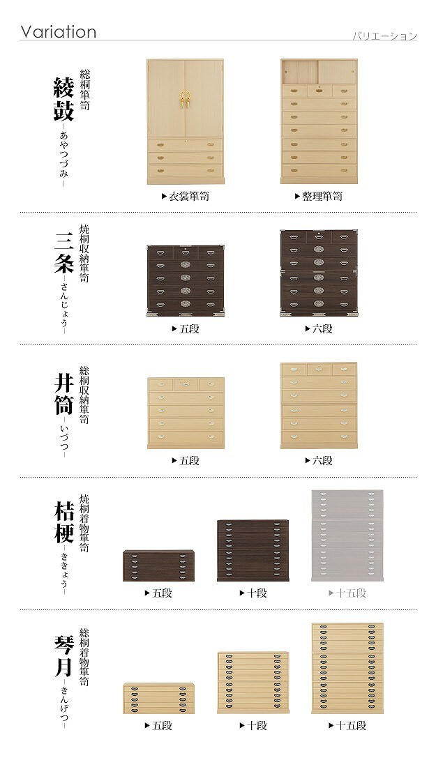 商品について:引出し15段の着物箪笥。趣のある焼桐仕上げです。18mm厚の天然木をふんだんに使用した贅沢なつくり。板が厚いと狂いも少なくなりますので、長くお使いいただけます。引出しはしっかりしたつくりの「留め加工」を用い、金釘を使用しておりません。また、引出しの横には溝がありますので、持ち運びの際に持ち手になり便利です。取っ手の金具には縁起が良いとされる七宝をあしらいました。たとう紙が入る大きさですので着物の収納に最適。匠による伝統の技で、堅牢に美しく仕上げたこだわりの桐タンスです。