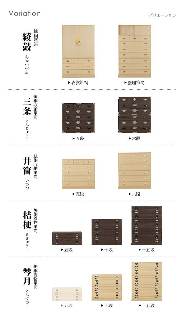 商品について:引出し5段の総桐着物箪笥。18mm厚の天然木をふんだんに使用した贅沢なつくり。板が厚いと狂いも少なくなりますので、長くお使いいただけます。引出しはしっかりしたつくりの「留め加工」を用い、金釘を使用しておりません。また、引出しの横には溝がありますので、持ち運びの際に持ち手になり便利です。取っ手の金具には縁起が良いとされる七宝をあしらいました。たとう紙が入る大きさですので着物の収納に最適。匠による伝統の技で、堅牢に美しく仕上げたこだわりの桐タンスです。