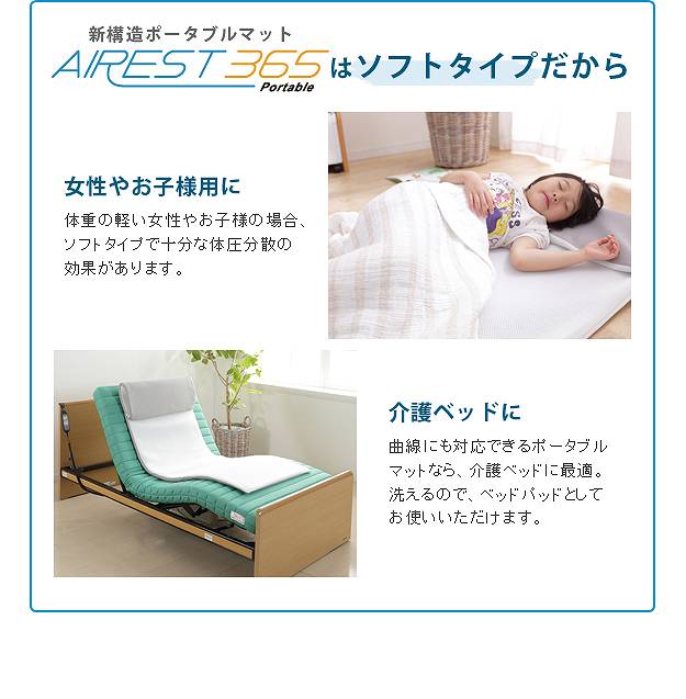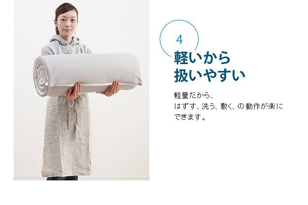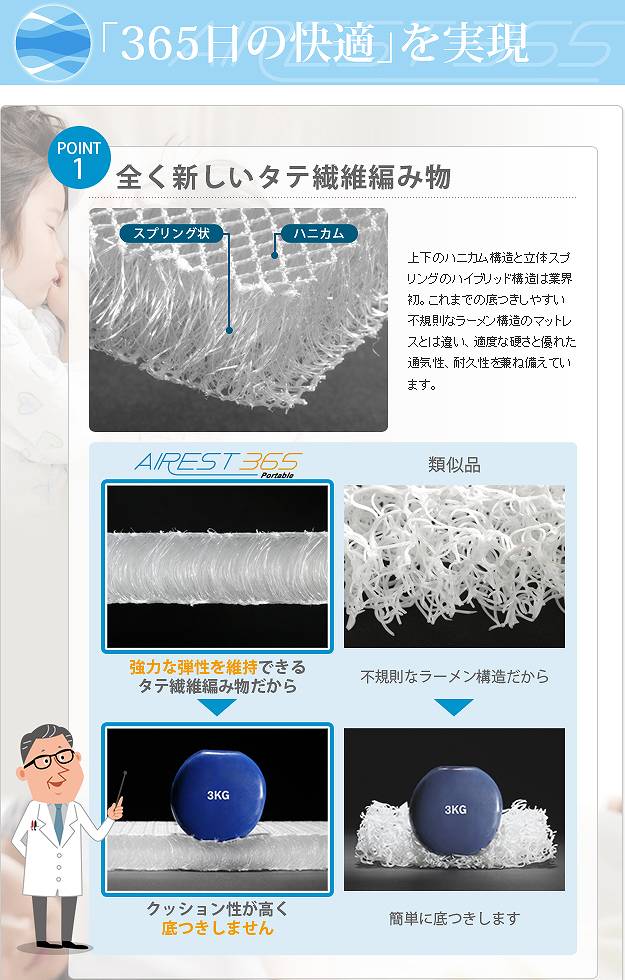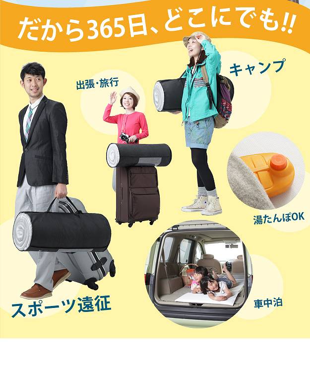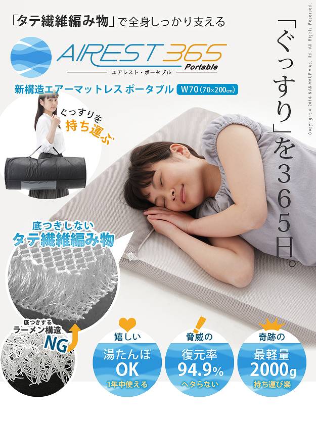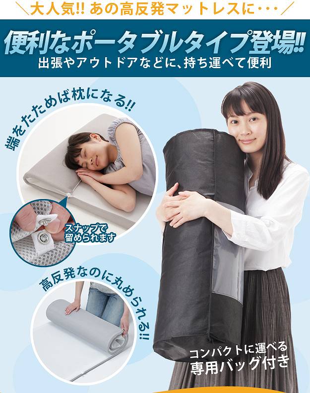 商品について:へたりにくい立体構造のポータブルマット。新開発のソフト立体構造編物が新感覚の新しい寝心地を実現。睡眠中の身体をバランスよく支え心地よい眠りを誘います。70x200cmタイプはスナップで折り返し枕にできます。コンパクトなロール収納で持ち運びラクラク☆中材はシャワーで水洗いできるうえ速乾性も抜群。カバーも洗濯機で丸洗い可能なので、清潔にお使いいただけます。電気毛布や湯たんぽとの併用もOKです。