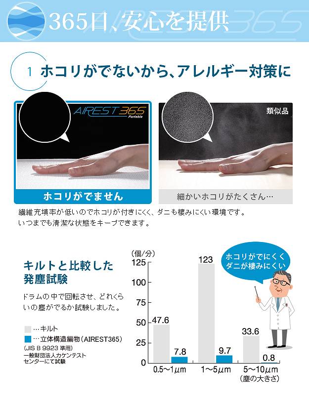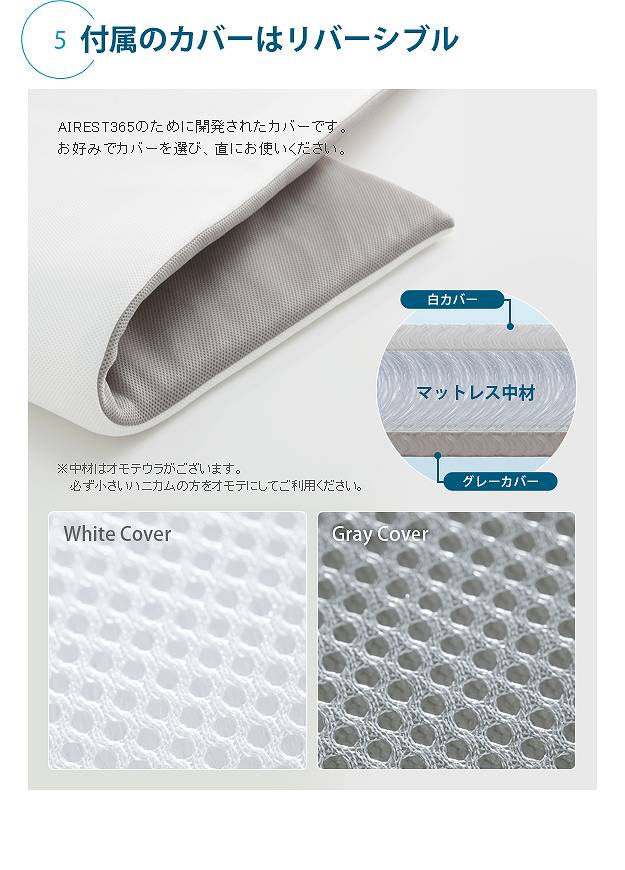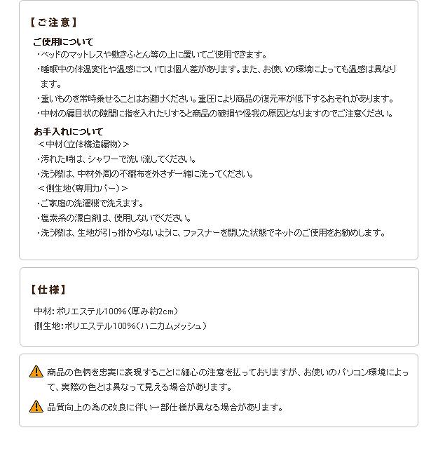 材質:中材-ポリエステル100%(ソフト立体構造織物)、側生地-ポリエステル100%(ハニカムメッシュ)
