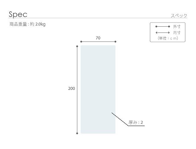 サイズ(cm):幅70x奥行200x厚さ2cm・約2kg、中材-約2cm厚