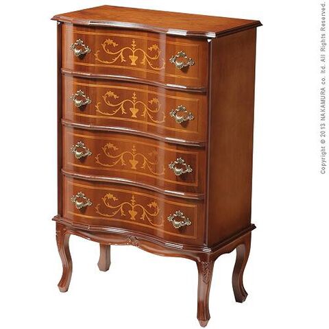 商品について:芸術作品ともいえるイタリア直輸入家具をご自宅に☆ヴェローナクラシック猫脚4段チェスト幅58cm。艶やかな色合いと、滑らかな曲線を描くフォルムがお部屋をエレガントに演出します。彫刻が美しい猫脚も魅力的。引き出しの前板にはイタリア伝統の職人技である象嵌細工が施されています。