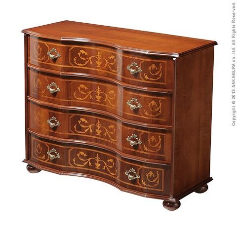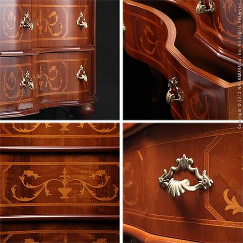 商品について:芸術作品ともいえるイタリア直輸入家具をご自宅に☆ヴェローナクラシック丸脚4段チェスト。艶やかな色合いと、滑らかな曲線を描くフォルムがお部屋をエレガントに演出します。引き出しの前板にはイタリア伝統の職人技である象嵌細工が施されています。