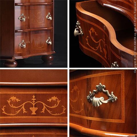 商品について:芸術作品ともいえるイタリア直輸入家具をご自宅に☆ヴェローナクラシック丸脚ファックス台。艶やかな色合いと、滑らかな曲線を描くフォルムがお部屋をエレガントに演出します。引き出しの前板にはイタリア伝統の職人技である象嵌細工が施されています。