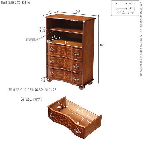 引出し内寸-幅48.5x奥行22.5(最大25.5)x高さ12cm