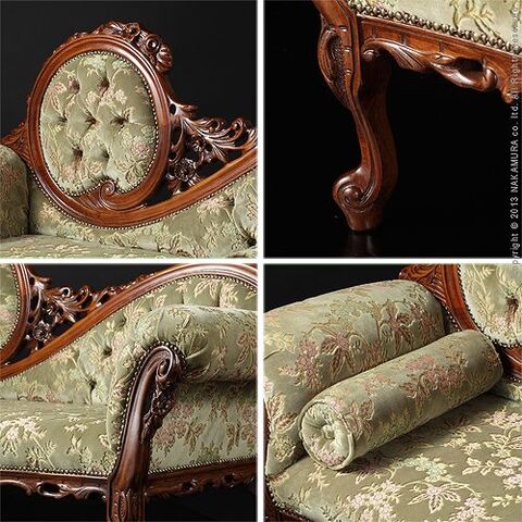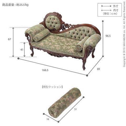 商品について:芸術作品ともいえるイタリア直輸入家具をご自宅に☆ヴェローナクラシック金華山カウチソファ。立体感のあるしっとりとした質感の金華山織は華やかで高級感があります。フレームに施された彫刻と美しい猫脚も魅力的。滑らかな曲線を描くフォルムと豪華な金華山織がお部屋をエレガントに演出します。筒型クッション2個付き。