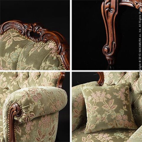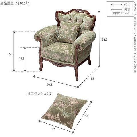 商品について:芸術作品ともいえるイタリア直輸入家具をご自宅に☆ヴェローナクラシック金華山ソファ(1人掛け)。立体感のあるしっとりとした質感の金華山織は華やかで高級感があります。フレームに施された彫刻と美しい猫脚も魅力的。滑らかな曲線を描くフォルムと豪華な金華山織がお部屋をエレガントに演出します。ミニクッション1個付き。