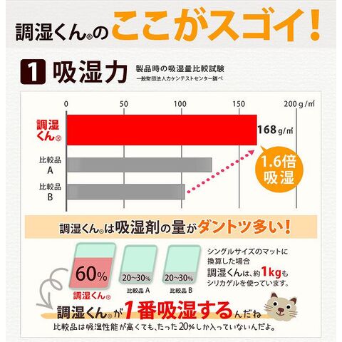 商品について:敷布団やベッドパットの下に敷くだけで湿気を吸収してくれる湿度調整マットです。周囲に合わせて吸湿・放湿をすることで快適な湿度を保ち、ダニやカビの繁殖を抑えます。調湿マットに使用されているシリカゲルは調湿効果とともにニオイ成分も吸着してくれるので、消臭効果も得られるのが特徴です。梅雨時のジメジメや冬場の結露、夏の汗が気になる季節でも布団やベッドを快適に保ってくれます。干し時がわかる吸湿センサー付き。天日に干すと吸湿力が回復し、繰り返しお使いいただけます。ご家庭の洗濯機(手洗い・ドライコース)で丸洗いが可能です。