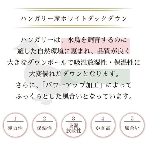 羽毛のフンワリ感をアップさせる「パワーアップ加工」を施し、ふっくらとした風合いになっています。