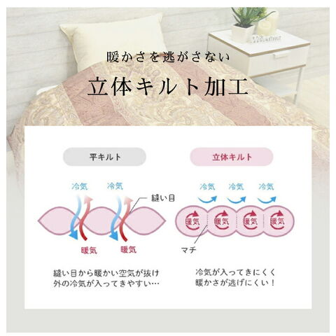 羽毛の片寄りをなくす為、またかさ高を保つため、「立体キルト加工」を施しており布団がふっくらするようになっています。